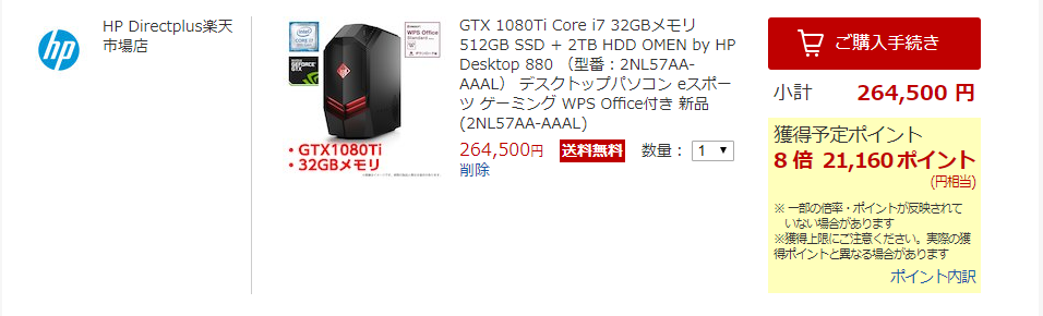 僕が普段利用している楽天サービスのおかげでポイント還元が8倍となり、1万円ほどhpダイレクトで購入するよりも安く買うことができます。これももちろん一例で、楽天のクレジットカードなどを使てないとポイント還元が受けられず安くならなかったり、そもそもポイントをもらっても使い道がないという人もいるでしょう。