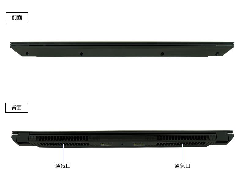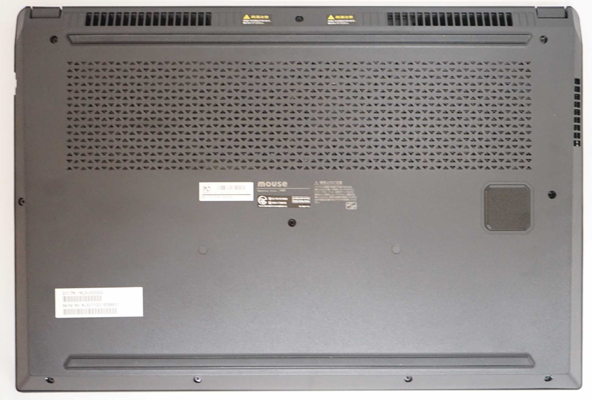 全体的にフラットなデザインをしているという感想。底面はコンパクトにまとめるためかバッテリーが装着済み。エアフローは▼の穴と上部と右部から排熱しています。