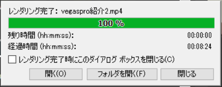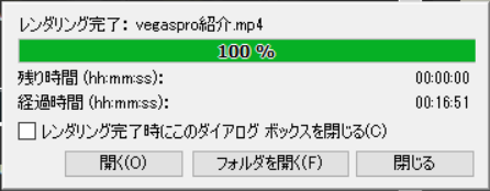 プロ向け動画編集ソフト『Vegas Pro15』を用い5分程度に編集された動画をYouTube向けのフォーマットにエンコードした結果です。