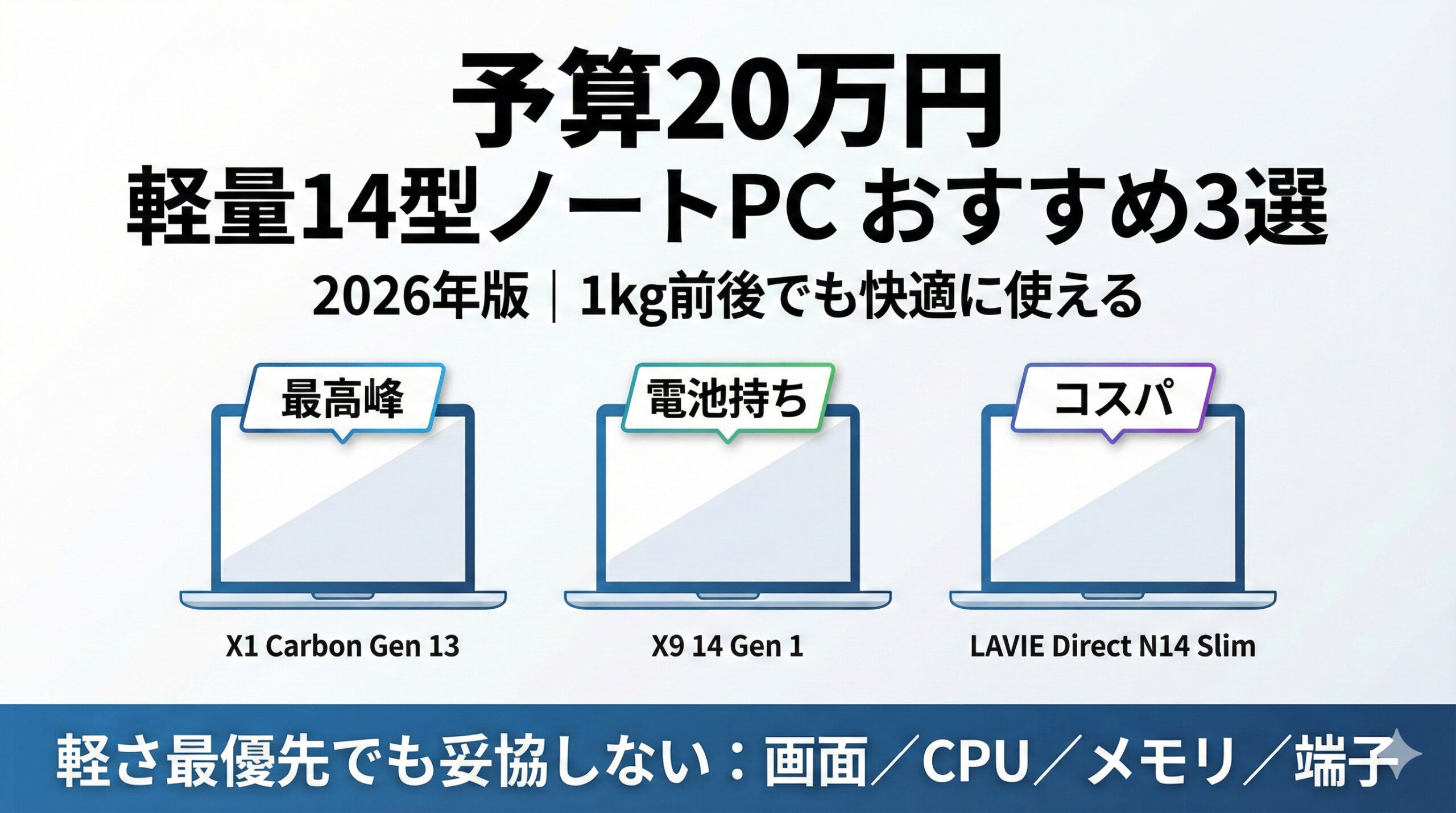 軽量14型は、どれも「軽い」こと自体は前提になってきました。ここから先は、何を優先するかで選ぶのが最短です。本記事では、次の3つの枠に分けておすすめモデルを厳選しました。