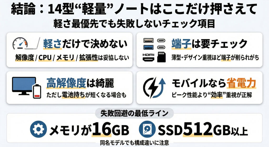 14型の軽量ノートPCは、持ち運びのしやすさが最大の魅力です。ただし、軽さを最優先にするほど「性能や使い勝手が削られているモデル」も混ざるため、最低限チェックすべきポイントがあります。