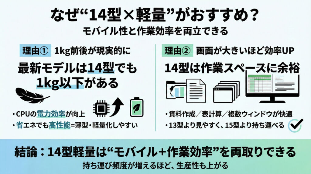 つまり14型の軽量モデルは、「モバイル性」と「作業効率」を同時に取りにいける、いま最もバランスの良い選択肢と言えます。