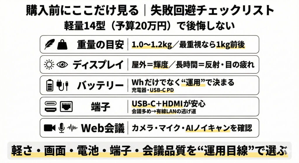 - 軽さだけで決めない:解像度/CPU/メモリ/拡張性は妥協しない