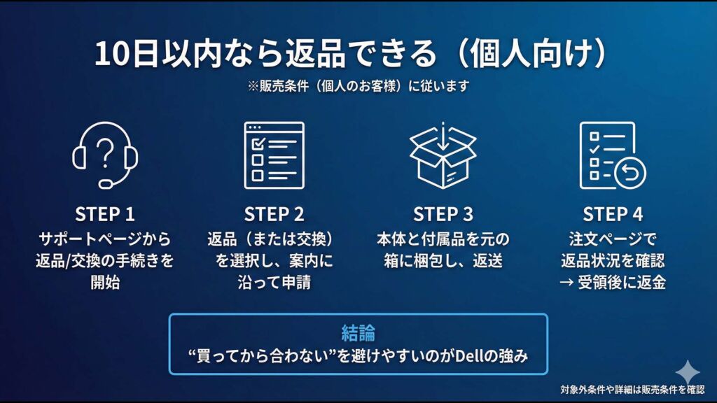デル(Dell)は、個人向けの購入でも返品制度が用意されています。案内では「到着後10日以内であれば返品が可能」とされており、購入後に「想像と違った」「自分の用途に合わなかった」と気づいたときの保険になります。