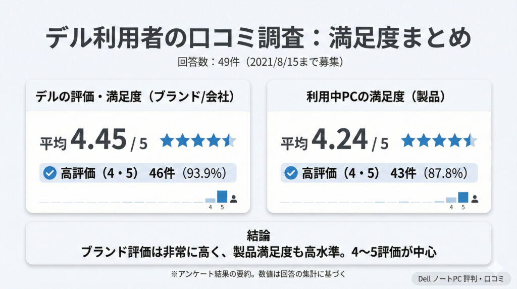 アンケートでは、満足度を5点満点で集計しており、全体として高評価が中心です。特に「ブランドとしてのデル」と「利用中PC(製品)」の2軸で評価が分かれている点がポイントです。