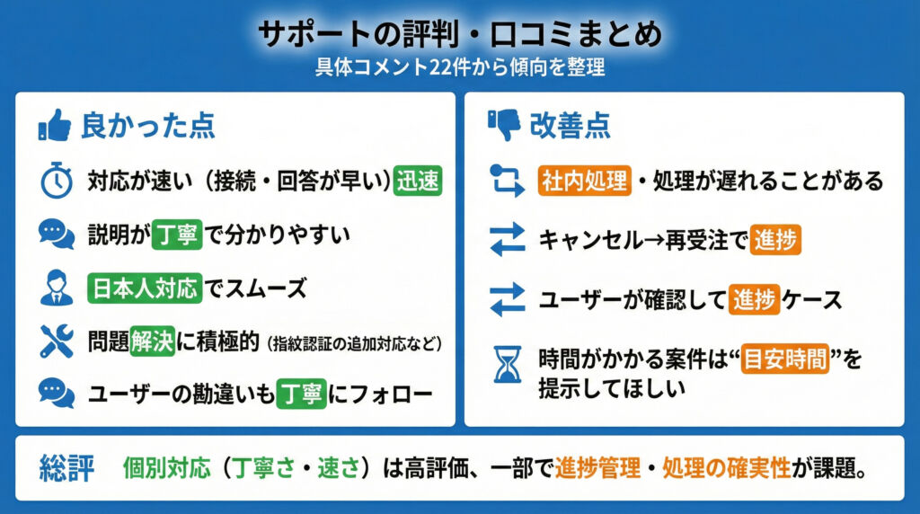 総合すると、担当者レベルの応対品質(丁寧さ・速さ)は高評価。一方で、処理の進捗管理や社内手続きの透明性には改善余地がある、という構図です。