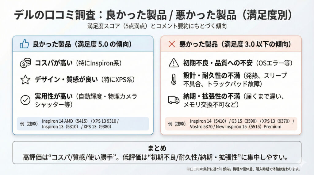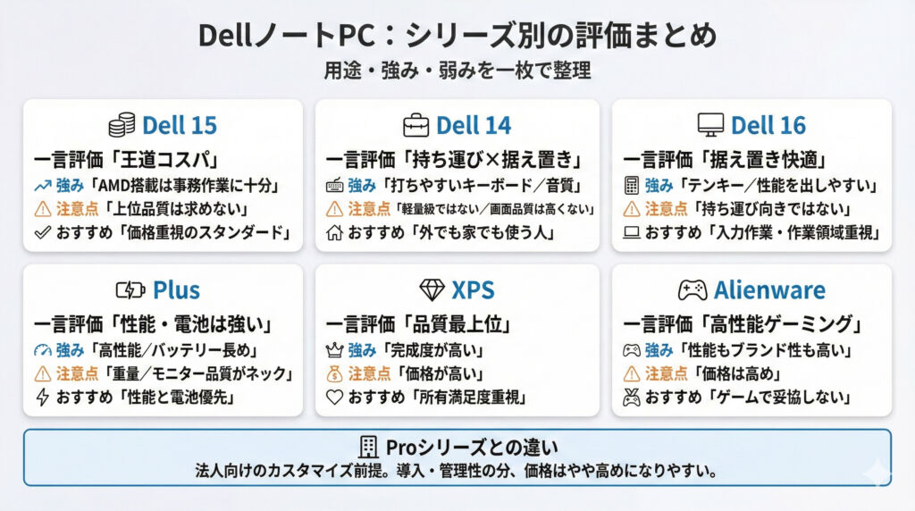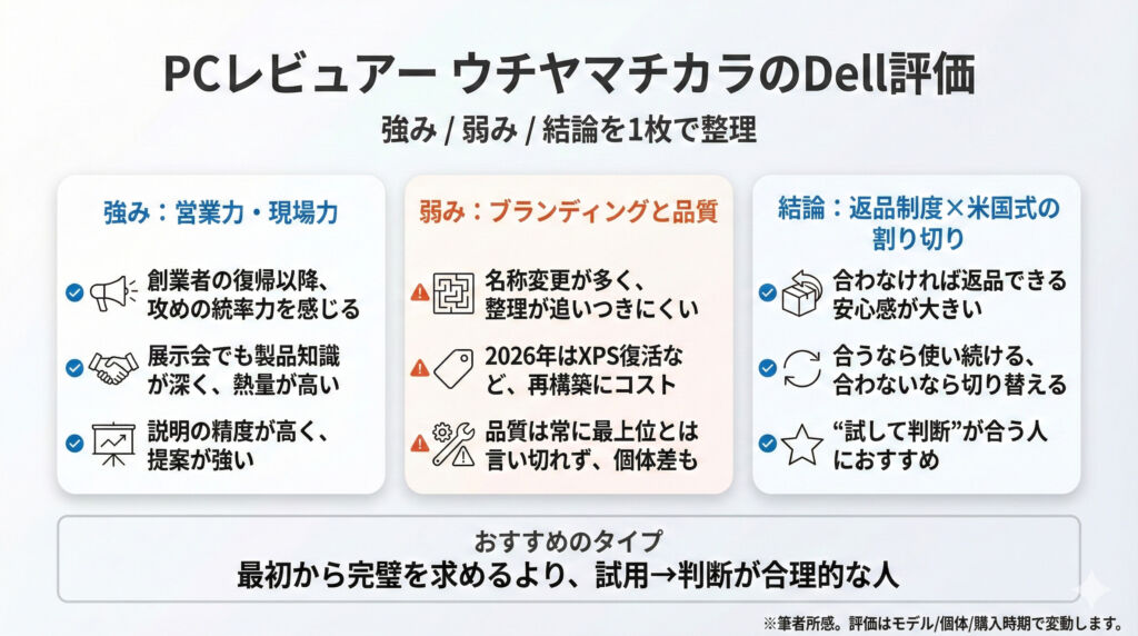 結論として、Dellは「最初から完璧な一台を探す」よりも、試して、合えば継続・合わなければ切り替えるというスタイルが合う人におすすめできます。購入のハードルを下げる仕組みを持っているメーカー、という評価です。