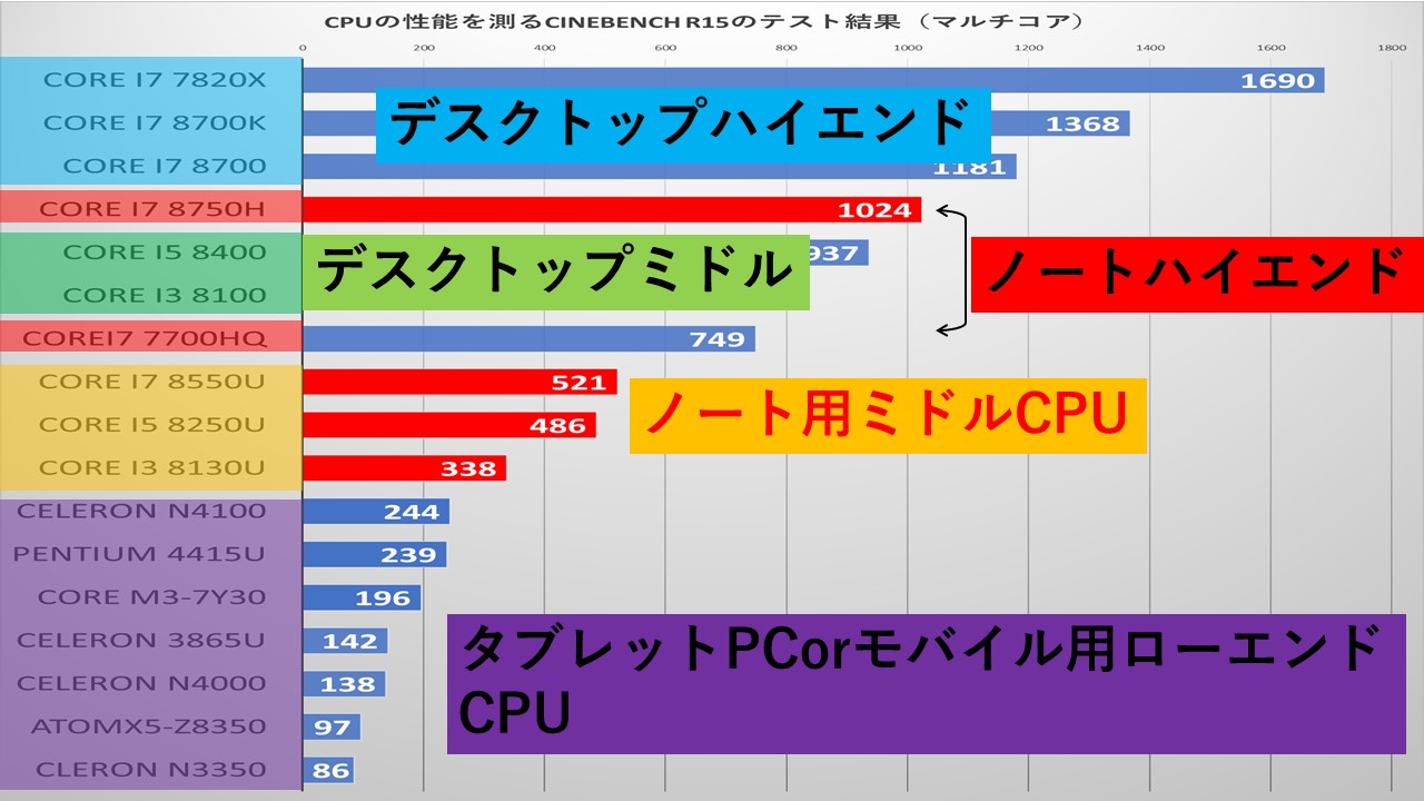 Core i5 8250UやCore i5 8265UはデスクトップPCやノートPCで展開されるすべてのCPUの中でも真ん中、つまり標準的な性能なのです。