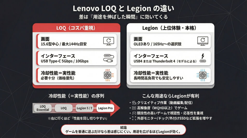 つまり、LOQとLegionの差は「ゲームが動くか」ではなく、用途を広げたときの伸びしろと満足度に出ます。