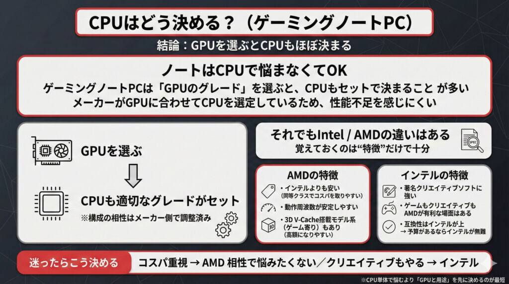 • ただし大前提として、ゲーミングノートは GPUに合わせてCPUも適切に組まれているので、CPU単体で悩みすぎなくてOK