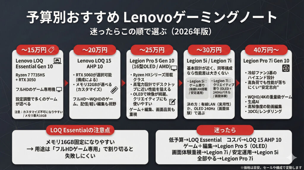 配信・動画編集・高解像度(WQHD以上)まで欲張るなら、LOQの上位モデルやLegion系に寄せたほうが満足度が上がります。