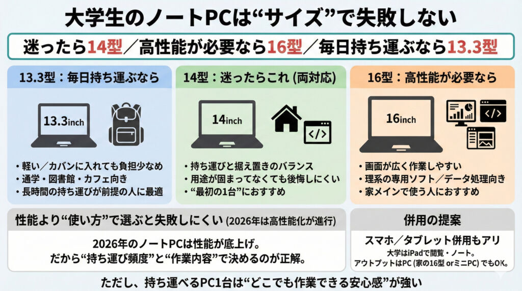 迷ったら14型/作業効率や性能重視なら16型/毎日持ち運ぶなら13.3型を基準に、ライフスタイルに合わせて選びましょう。