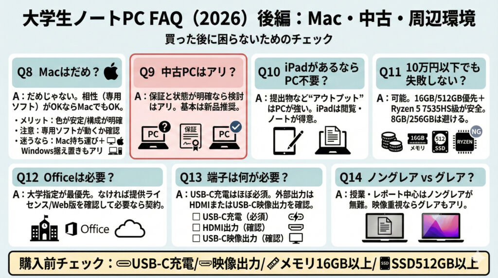 ただし注意点もあります。学科や授業で使うレガシーソフト/専用ソフトがMacで動くか不明なケースがあり、ここで詰むと結局Windowsが必要になります。また、端子や増設などの拡張性はWindows機より不利になりやすいです。