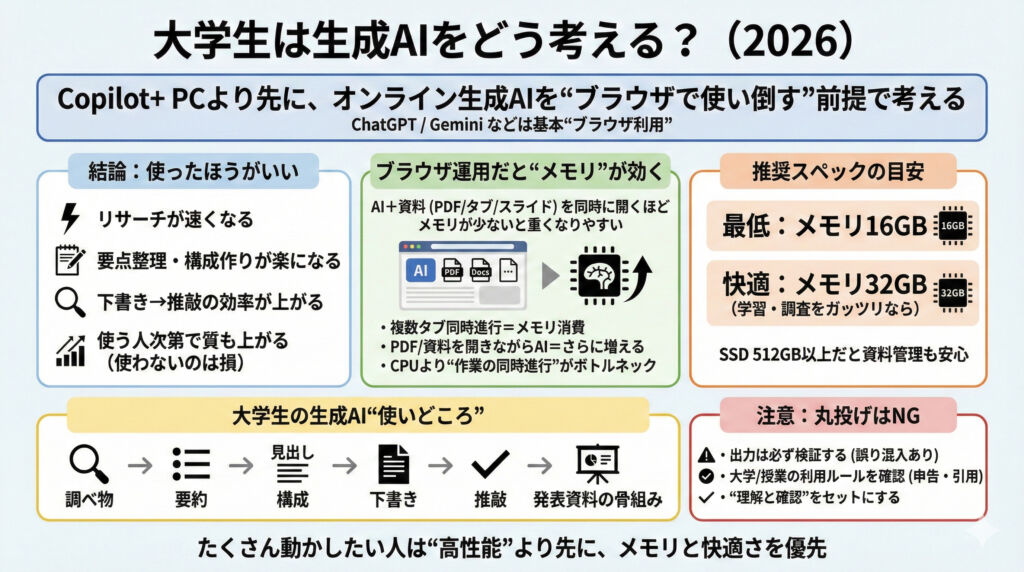 多くの学生は「Copilot+ PCかどうか」よりも、普段の作業が快適に回る構成(特にメモリ)のほうが重要です。