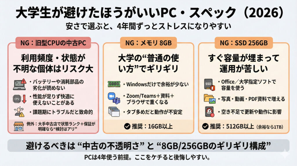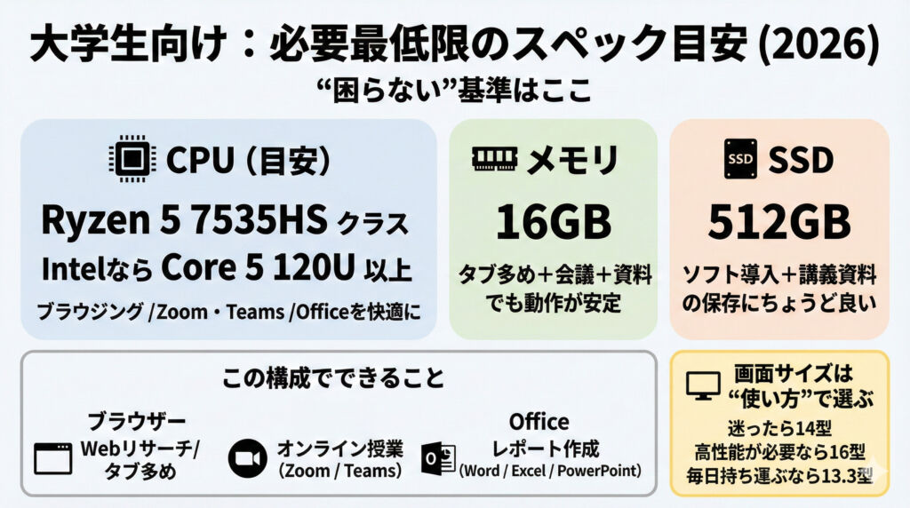 オンライン会議+ブラウザ+資料+Officeを同時に使うのが“大学の普通”なので、ここを下回ると重くなりやすいです。