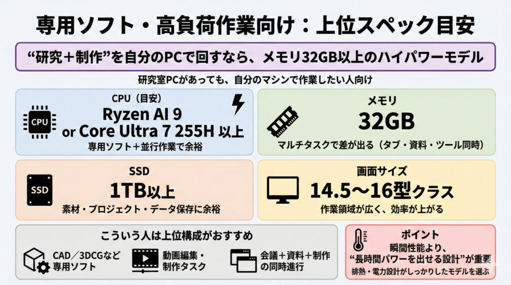 CADや3DCG、動画編集などの専用ソフトを動かす人、あるいはマルチタスクで高負荷作業をする人は、最低ラインの構成ではなく“上位構成”を選ぶのがおすすめです。