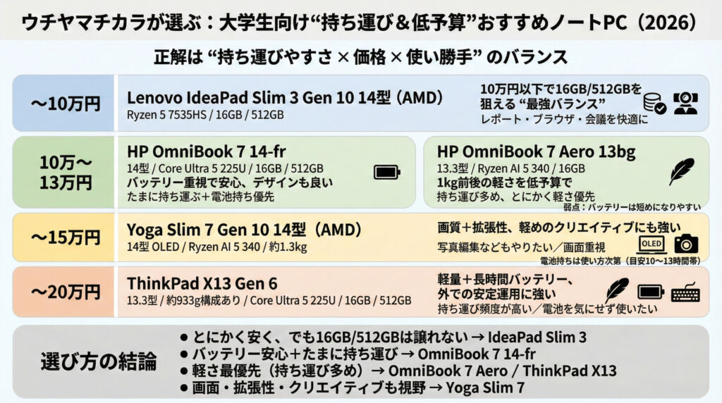 大学生向けのノートPCは、性能勝負というより “持ち運びやすさ × 価格 × 使い勝手” のバランスで選ぶのが正解です。