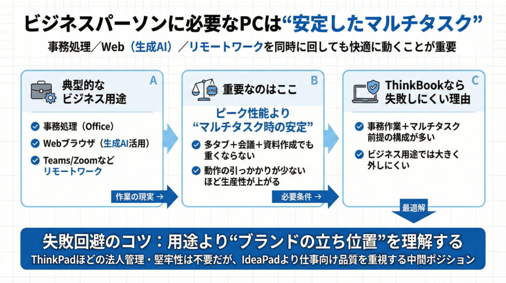ThinkBookは最初から仕事で使うことを前提に設計されているので、Office作業・ブラウザ多タブ・オンライン会議・生成AIの併用といった“現実の業務”で困りにくい構成になりやすいのが理由です。