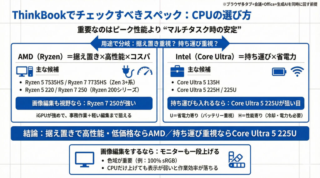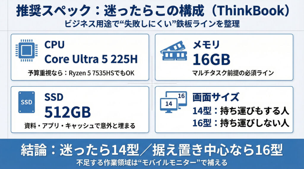 ThinkBookはこの用途に合わせた構成が多いので、基本的に大外しはしにくいのですが、CPUの世代と狙いどころだけは押さえておくと失敗が減ります。