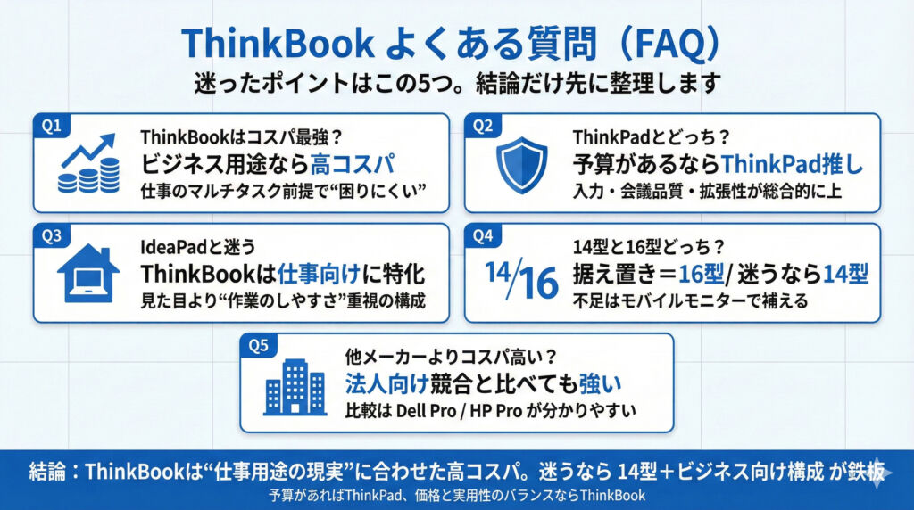 どちらかと言えば、ThinkBook選びで失敗しないコツは「用途」よりも、ブランドの立ち位置を理解することです。ThinkPadほどの堅牢性や法人管理を求めない一方で、IdeaPadより“仕事で困らない品質”を狙った中間のシリーズ。この位置づけを押さえておけば、ThinkBookは選びやすく、満足度も上がりやすいです。