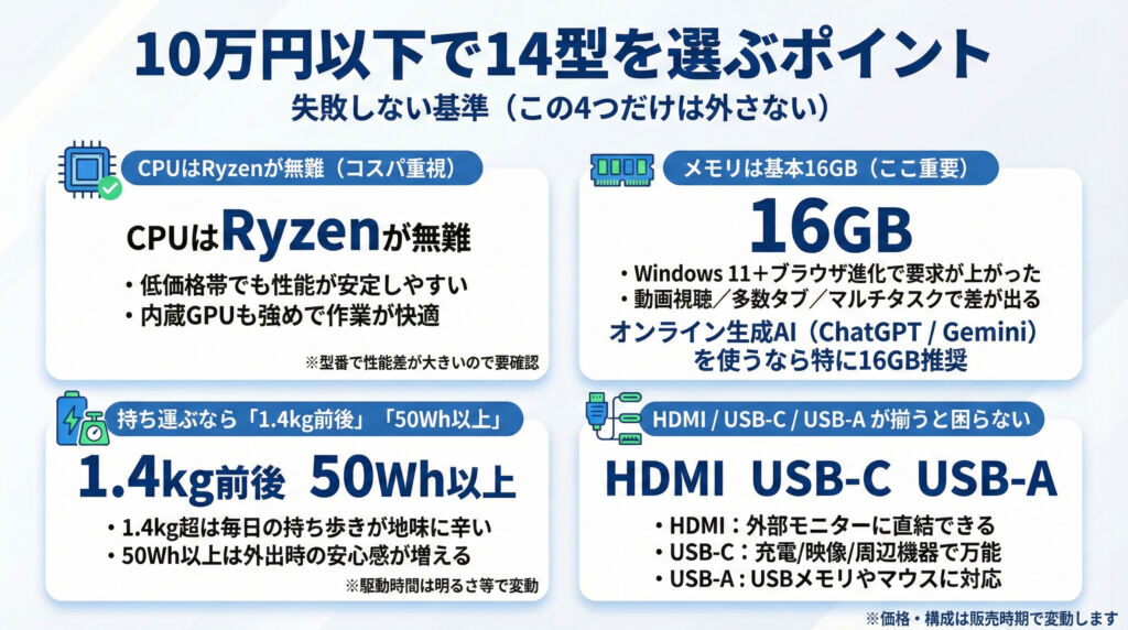 10万円以下の14型ノートPCは、スペック表だけ見ると似たモデルが多い一方で、使い勝手の差が体感に直結します。ここでは「最低限ここだけは外さない」基準を4つに絞って解説します。
