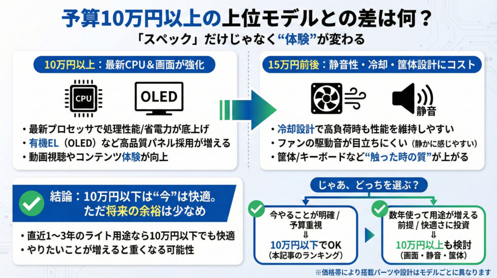 10万円以下のノートPCでも、直近1〜3年の用途(ブラウザ、Office、動画視聴、オンライン会議)なら快適に使えるモデルは多いです。