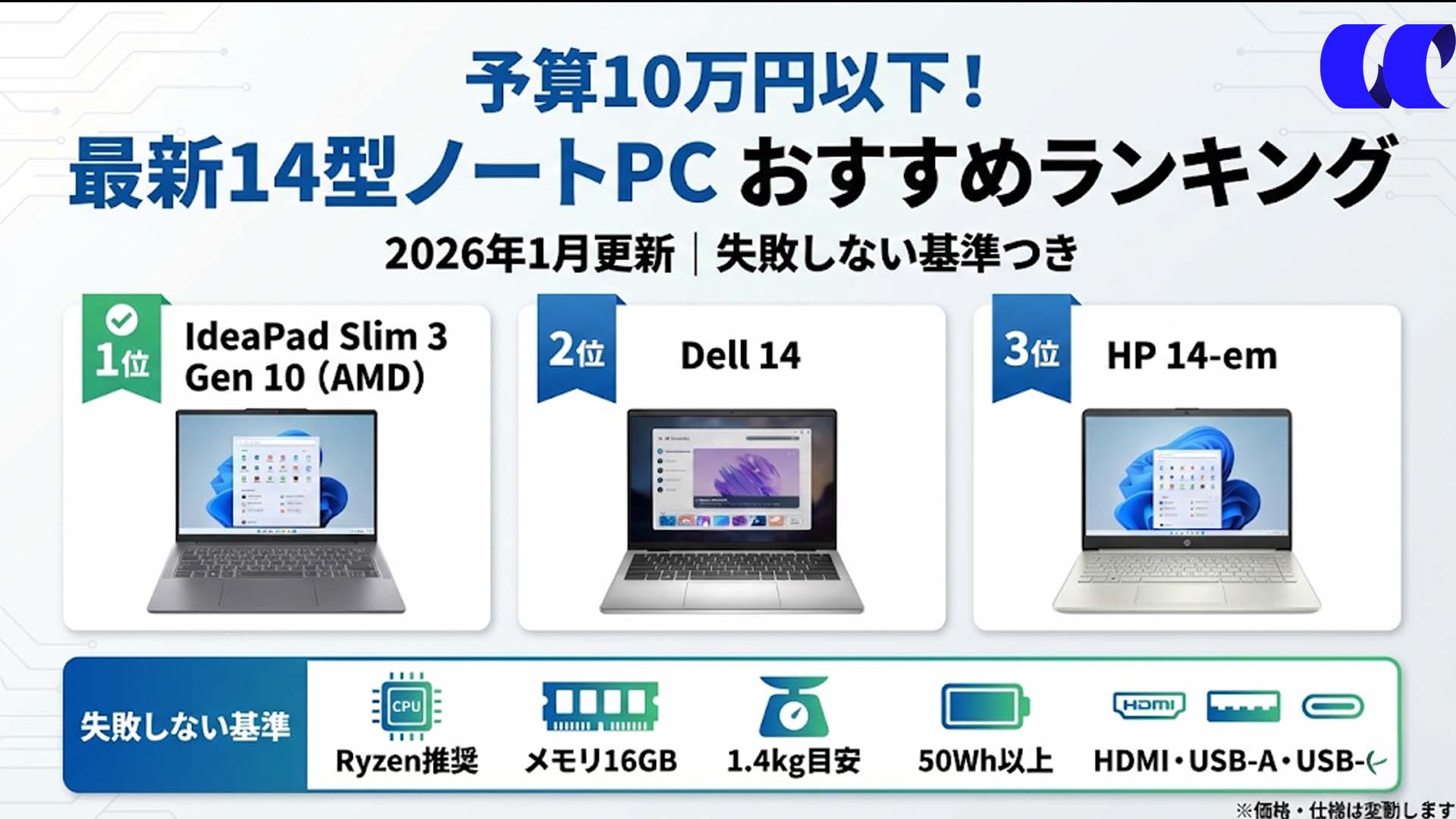 そこで本記事では、10万円以下でも失敗しないために“守るべき基準”を先に明確にしたうえで、最新のおすすめ14型ノートPCをランキング形式で紹介します。さらに、上位モデルとどこが違うのか(何を妥協しているのか)も具体的に解説するので、価格に納得しながら安心して選べるはずです。