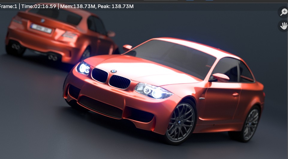 BlenderでBMWのサンプルデータをレンダリングしたところ、1フレームあたり約2分16秒で完了しました。