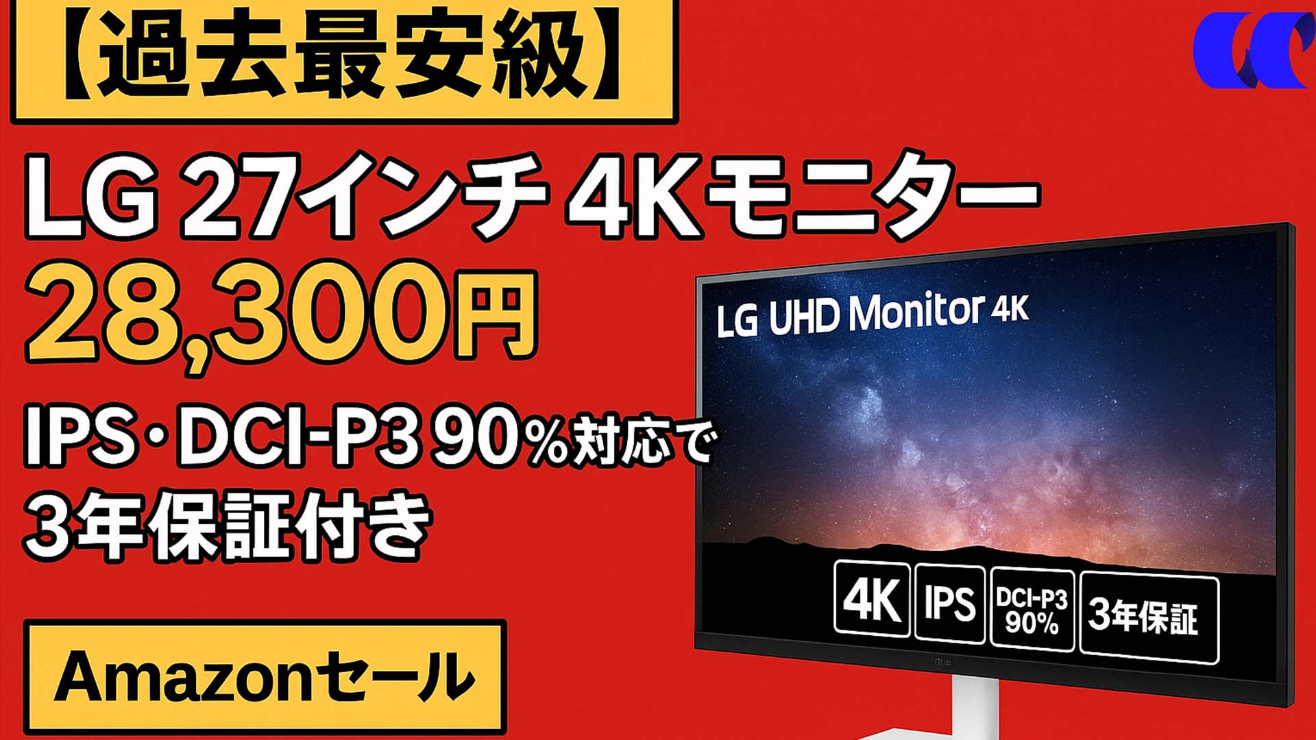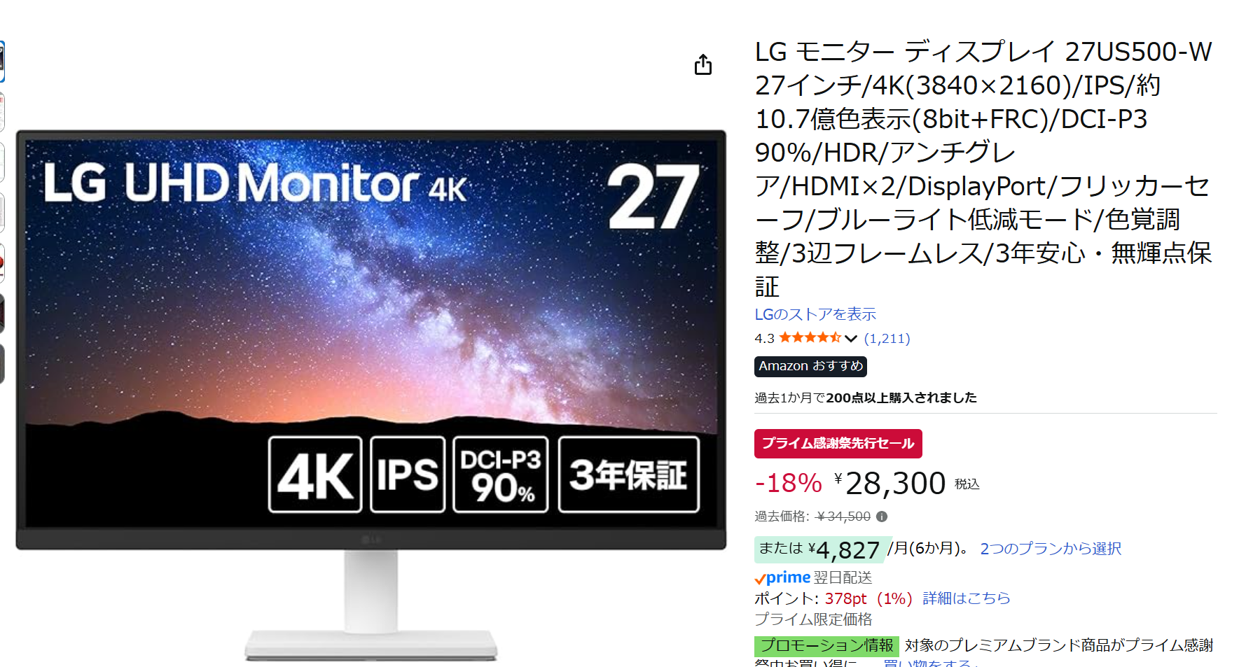 Amazonプライム感謝祭の先行セールで、LGの人気27インチ4Kモニター「27US500-W」が 28,300円(税込) で販売中です。