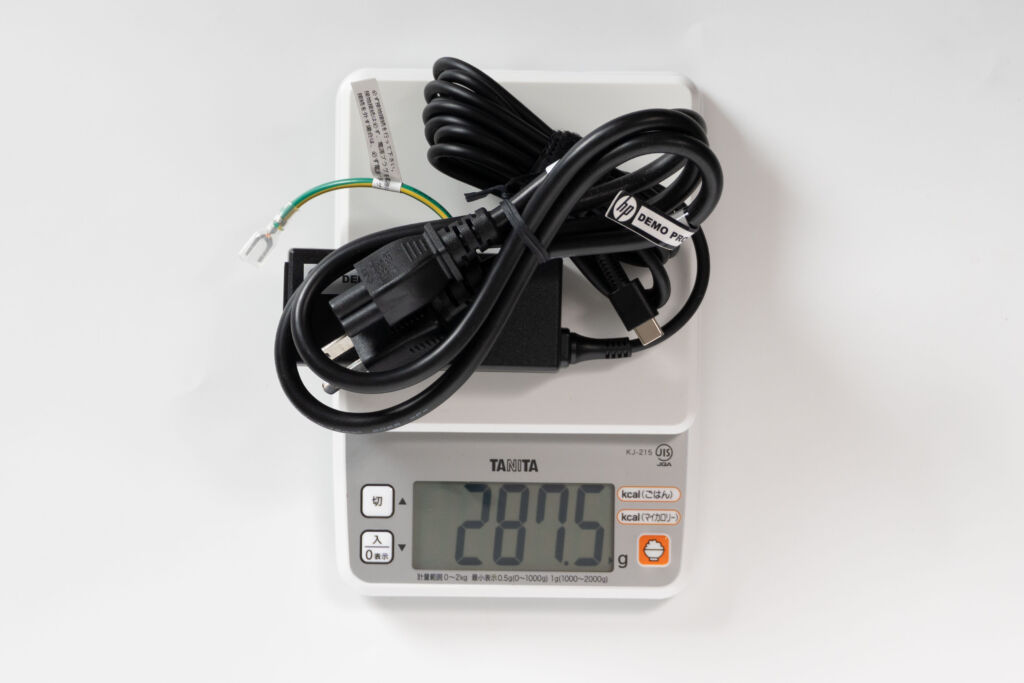 付属のACアダプターと電源ケーブルを含めると**合計約1.75kg前後(実測1,875g)**となり、モバイル用途での持ち歩きにはややずっしりと感じるかもしれません。