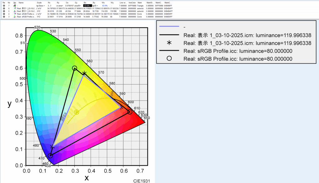 実測では**sRGBカバー率約63%**と、発色はやや控えめ。