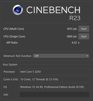 CPUには、**Intel Core 5 220U(10コア/12スレッド)**を搭載しています。