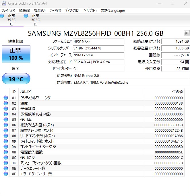 また、CrystalDiskInfo上では健康状態100%・温度39℃と、発熱も少なく安定した動作を確認できました。
