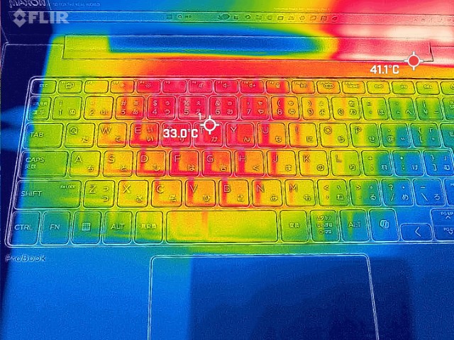 Cinebench R23実行中にサーモグラフィーカメラでキーボード表面温度を計測したところ、