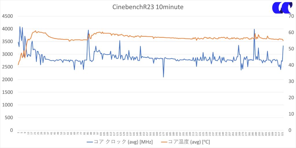 Cinebench R23を10分間連続で実行した際の挙動を確認すると、平均クロックはおおむね2.8〜3.0GHz前後で推移しました。