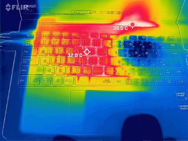Cinebench R23実行中のサーモグラフィー計測では、**キーボード中央部で約32℃、最も高い部分でも約39.5℃**に留まりました。