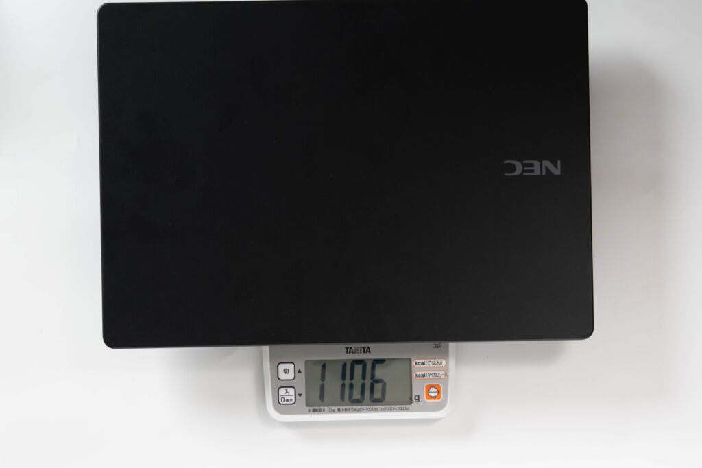 本体重量は**約1.1kg(実測1,106g)**で、14インチクラスのノートPCとしては非常に軽量です。