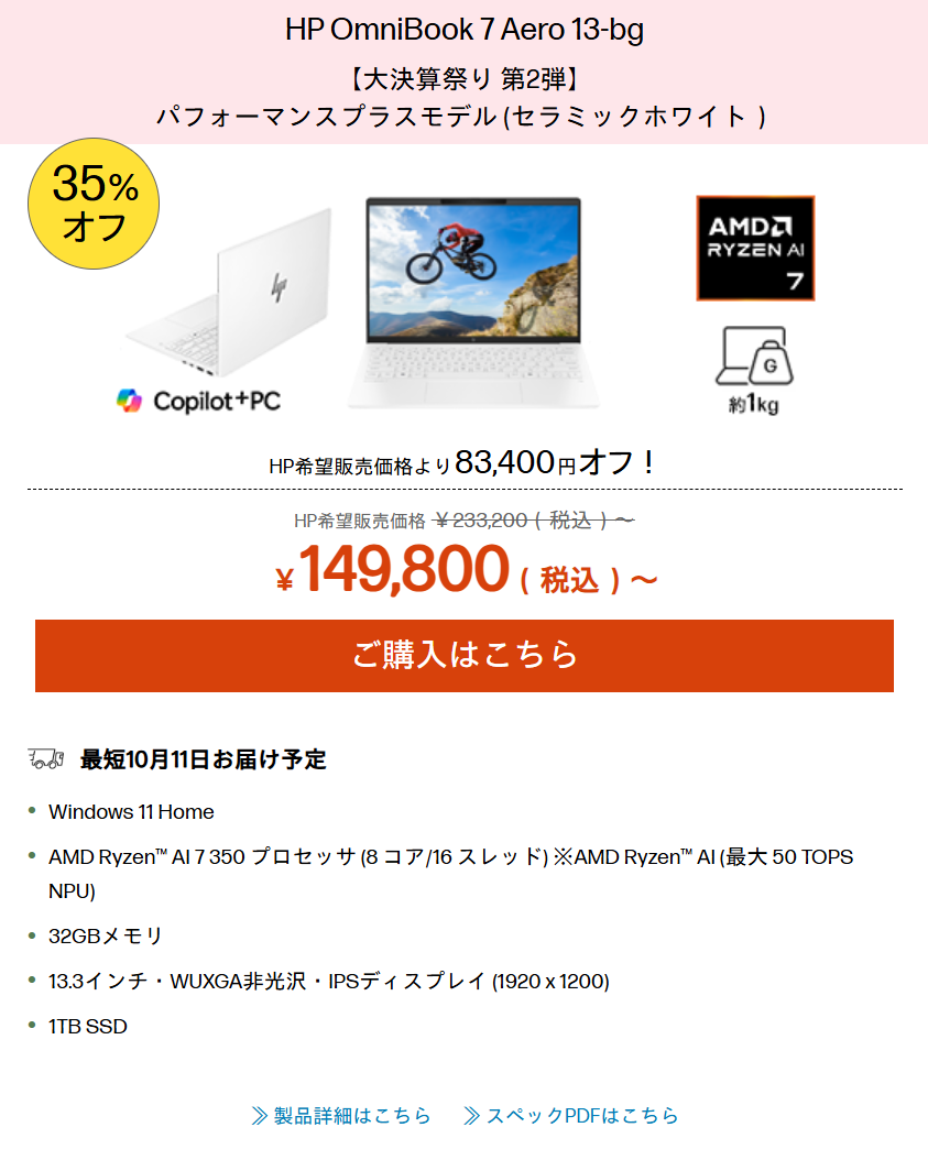 ホームセール【10月24日まで】1kgギリのAIノートPC「HP OmniBook 7 Aero 13-bg」が過去最安級!