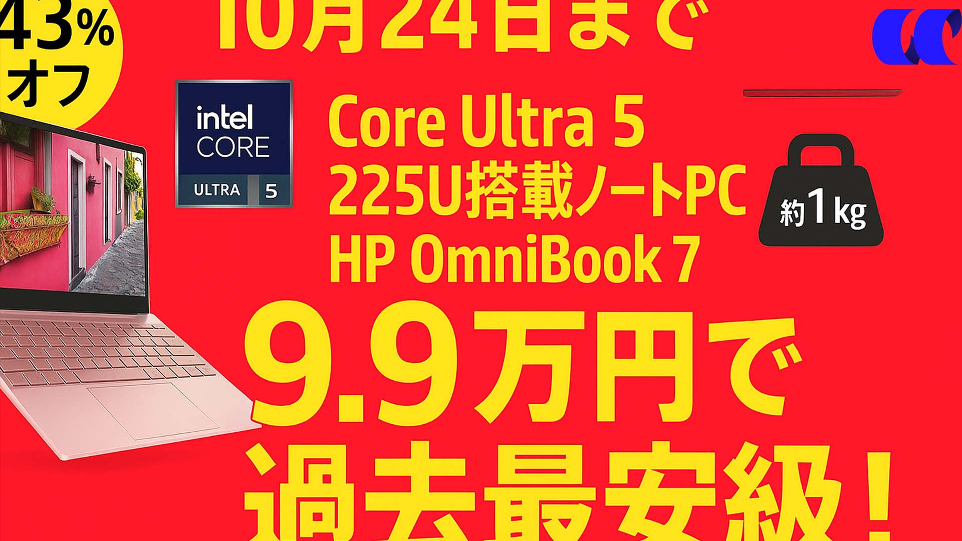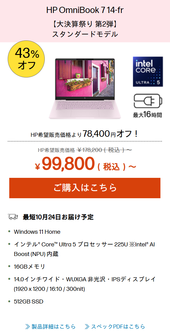 HPが開催中の「大決算祭 第2弾」で、人気の14インチモバイルノート「HP OmniBook 7 14-fr」が過去最安級となる**99,800円(税込)**で登場しました。