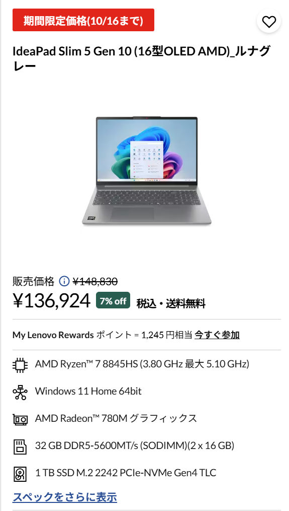 レノボの人気シリーズ「IdeaPad Slim 5 Gen 10(16型OLED AMD)」が、