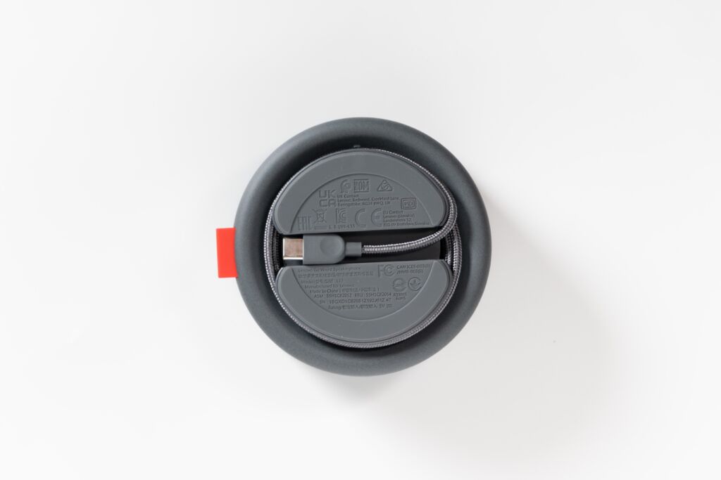 底面には収納式のUSB Type-Cケーブルが備わっており、未使用時はきれいに巻き付けて収納できる構造です。