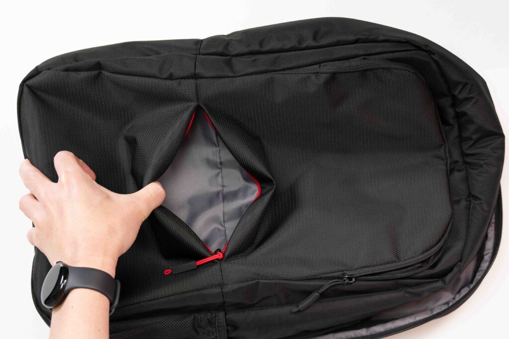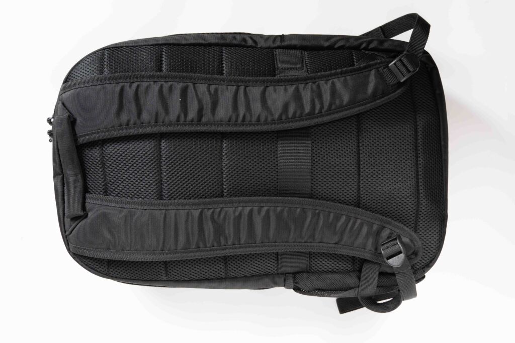 背面は通気性の高いメッシュ素材が採用されており、長時間の通勤・出張でも蒸れにくい設計です。