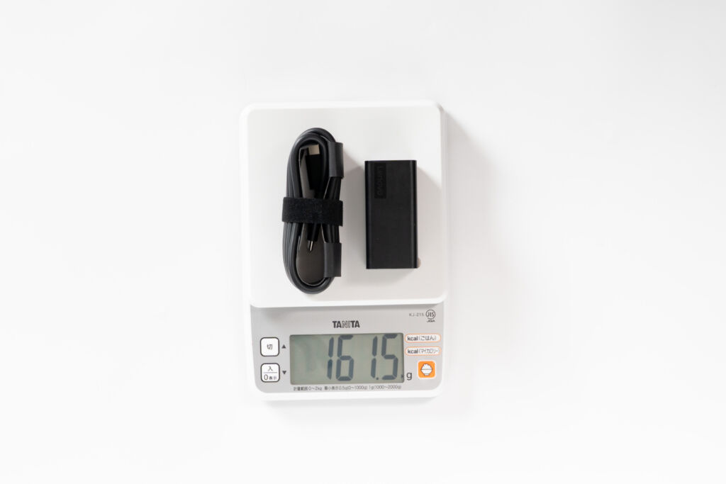 本体単体でわずか90g。ケーブル込みでも161gと、純正アダプターの約半分以下。