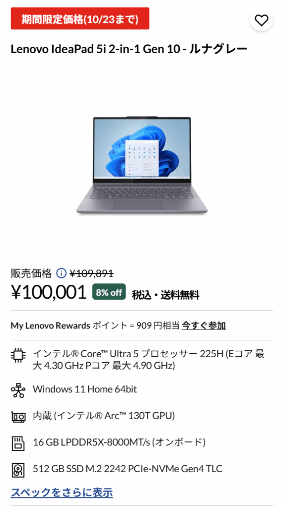 Lenovo公式ストアでは現在、最新の**Core Ultra 5 225H搭載2-in-1ノートPC「IdeaPad 5i 2-in-1 Gen 10」**が