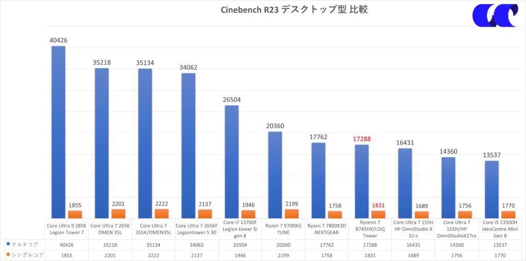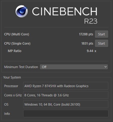 Cinebench R23で計測した結果、マルチコア17,288pts/シングルコア1,831ptsを記録しました。