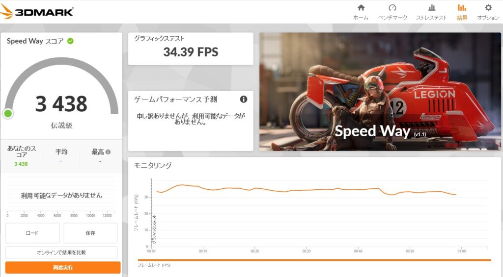 3DMark Speed Way(DX12 Ultimate対応)のベンチマークでは、スコア3,438/平均34.3fpsを記録しました。