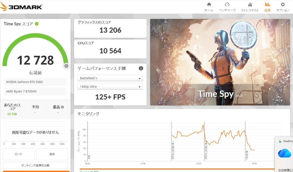 3DMark Time Spyのスコアは、総合12,728点/グラフィックスコア13,206点という結果でした。