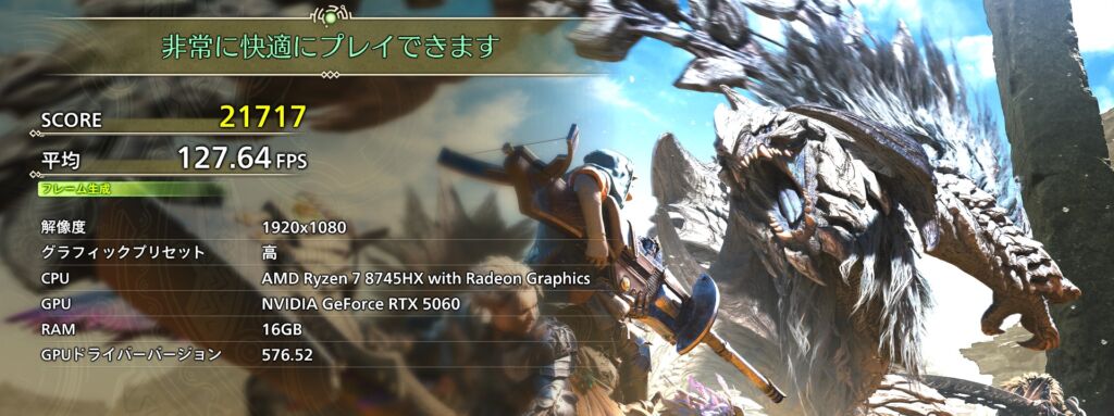 RTX 5060を搭載する本機では滑らかに描画され、安定したフレームレートを維持できています。