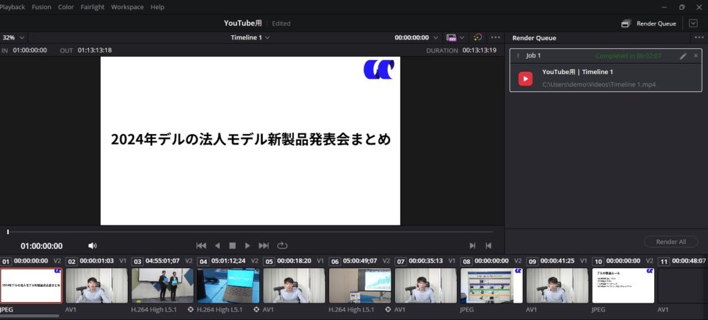 DaVinci Resolveで13分の動画を**YouTubeプリセット(H.264コーデック)**でエンコードしたところ、