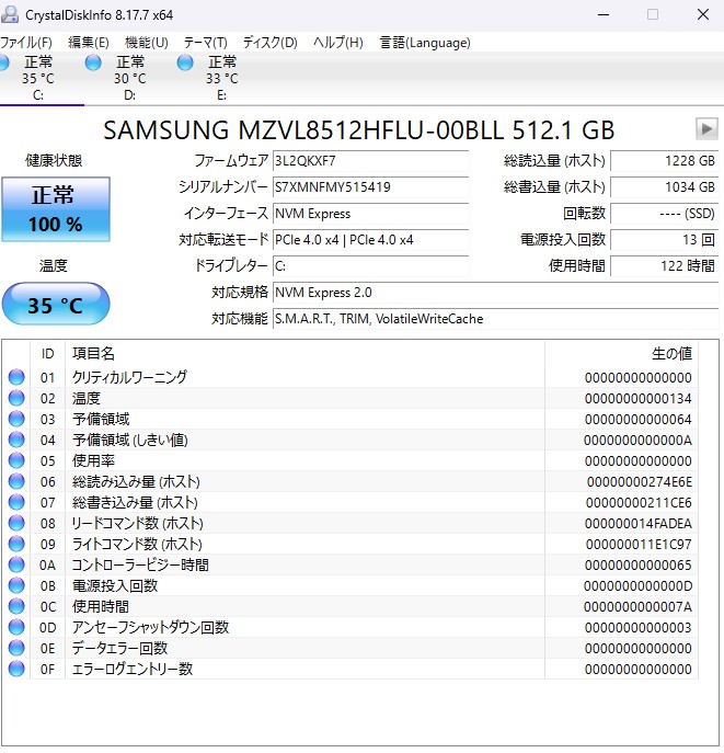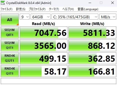 最新のNVMe規格らしい非常に高速な転送速度を記録しました。